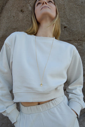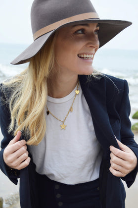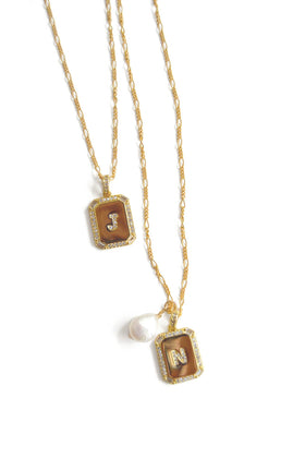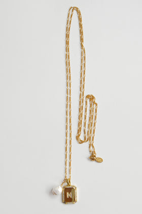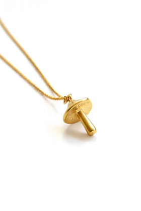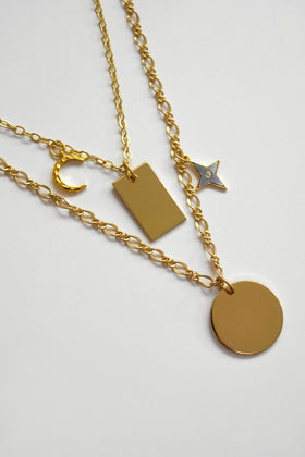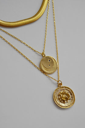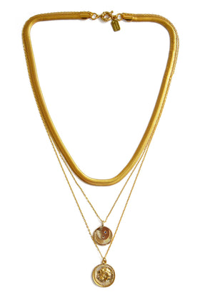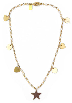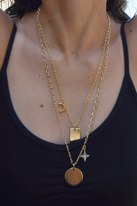 A long Y shaped necklace made of a rose tinted brass chain with two gold-plated brass beads at the chain join. Three antique bronze pendants hang from the base of the necklace; a spike, a sqaure, and a ring. The spike measures 1.25" long. The ring has a diameter of 7/8" and the sqaure pendant is 9/16"wide. The closure is a gold-plated trigger clasp. The neck chain is 23" with a 6" pendant drop length.